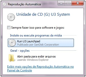 Esse pendrive vem com um software chamado U3 Launchpad. Logo que o dispositivo é inserido no PC e reconhecido pelo sistema, basta o usuário clicar no item "Run U3 Launchpad".